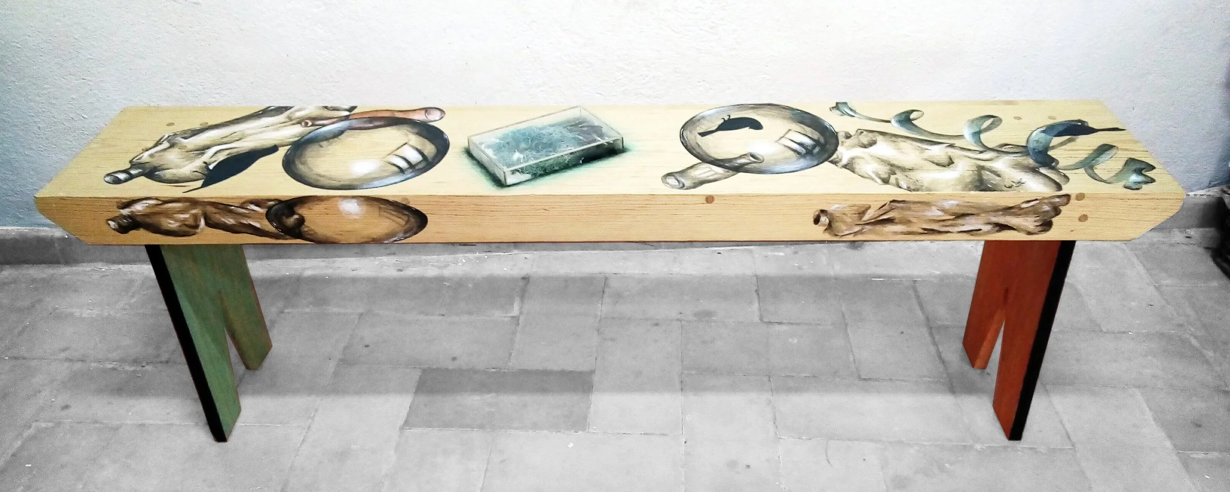 acrílico s/ madera, intervenida con caja de acrílico y nido de aves natural dentro, realizado 90% en plástico