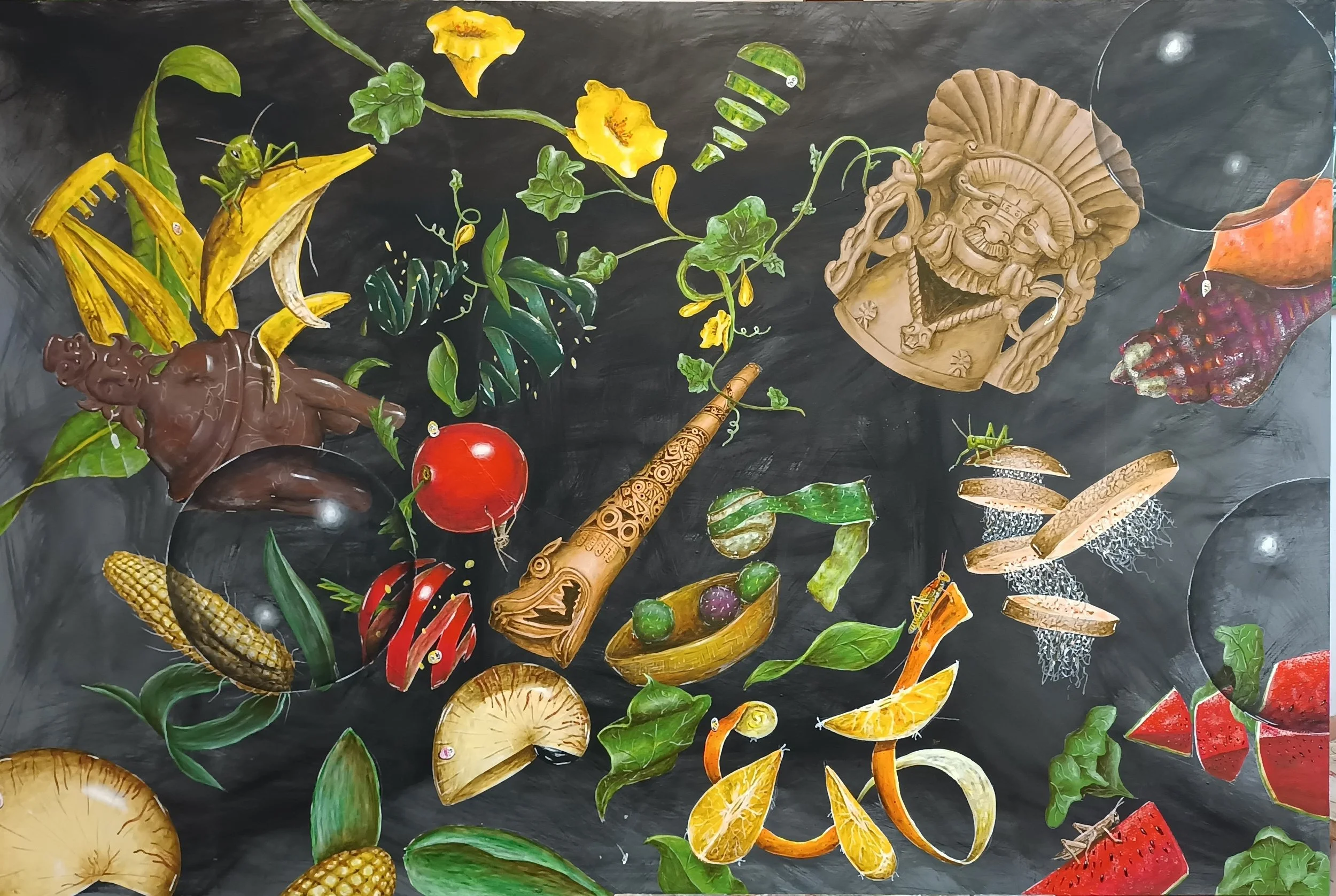 En suspensión con nopales e instrumento ritual de agua, prehispánico