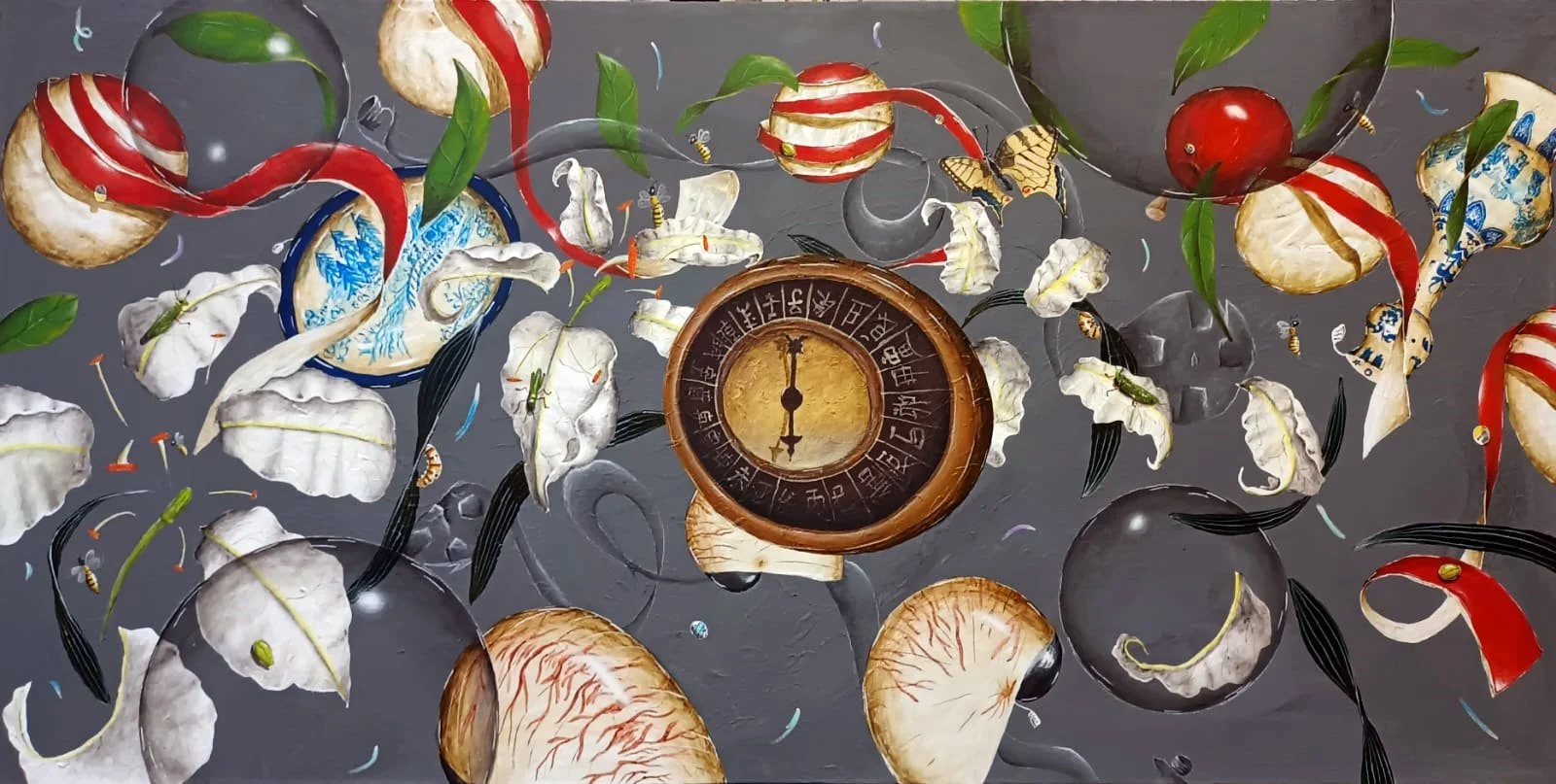 “Suspensión con porcelanas japonesas antiguas y cerezas“